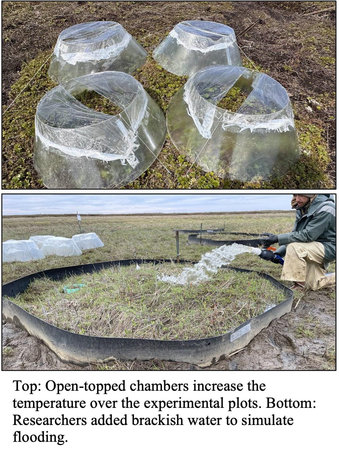 To tease apart the effects of warming and flooding, Karen, Katharine, and Joshua designed a field experiment to simulate climate change. They built clear plastic structures, called open-topped chambers, to trap heat and raise the temperature by about 2°C. These chambers can be thought of as mini time machines, creating small areas that have the expected temperatures of the coming decades. Next, they created flooded plots using brackish, or slightly salty, water that they collected where the fresh river water meets the sea.