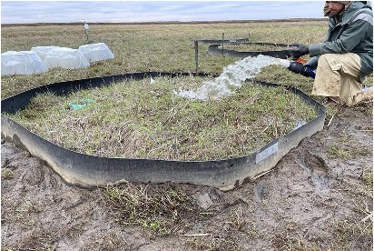Working in collaboration with the Chevak community and the Yukon Delta National Wildlife Refuge, they established experimental plots to simulate flooding. The flooded plots were created by pumping in seawater to simulate high-tide flooding. This was repeated 3 times during the summer. Karen, Kathy, and Josh also kept control plots where no salt water was added. The treatments were repeated at both high and low elevation sites. There were 7 replicates at each location.